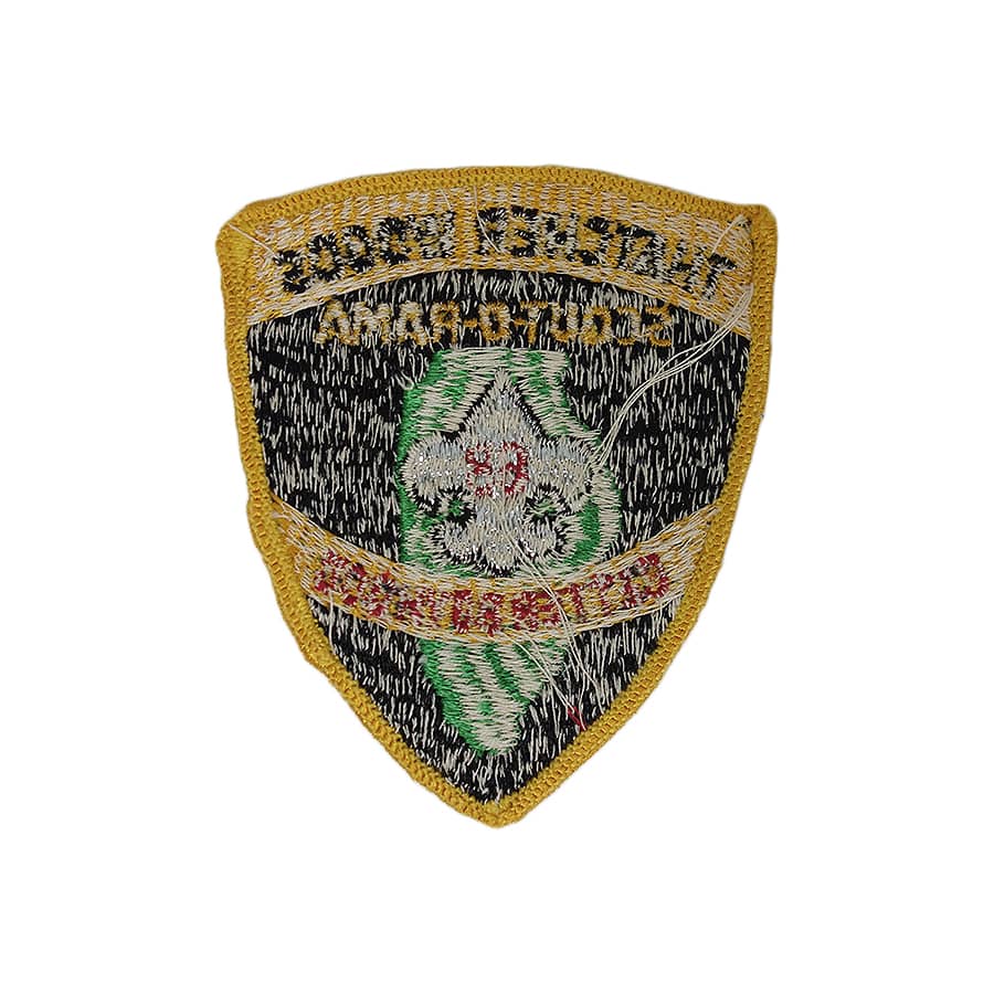アメリカから入荷しました、ビンテージのボーイスカウト ワッペン。 THATCHER WOODS SCOUT-O-RAMA。 縦 約8.9cm 横 約7.5cm 表面に、擦れ・ヨレあります。