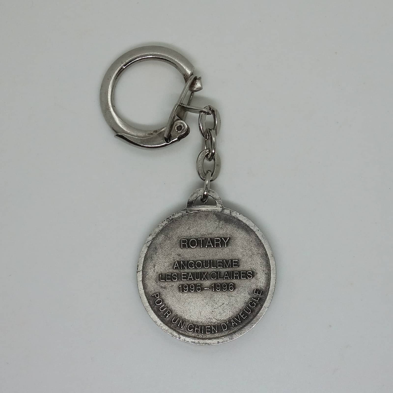 フランスで見つけた、フレンチ キーホルダー。 ROTARY ANGOULEME LES EAUX CLAIRES。 約3.0cm×約3.0cm 表面に、擦れ・擦れ汚れあります。