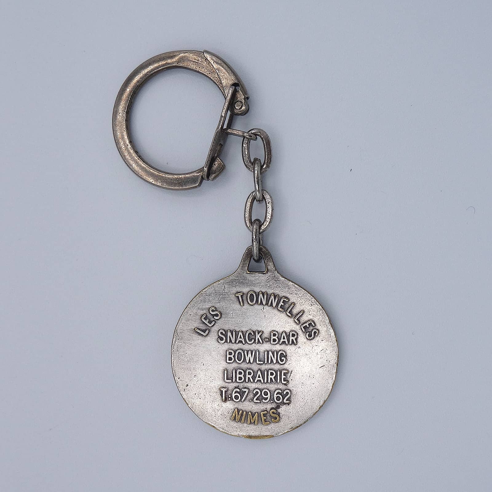 フランスで見つけた、ビンテージ フレンチ キーホルダー。 LES TONNELLES。 約3.0cm×約3.0cm 表面に、擦れ・擦れ汚れ・色落ちあります。